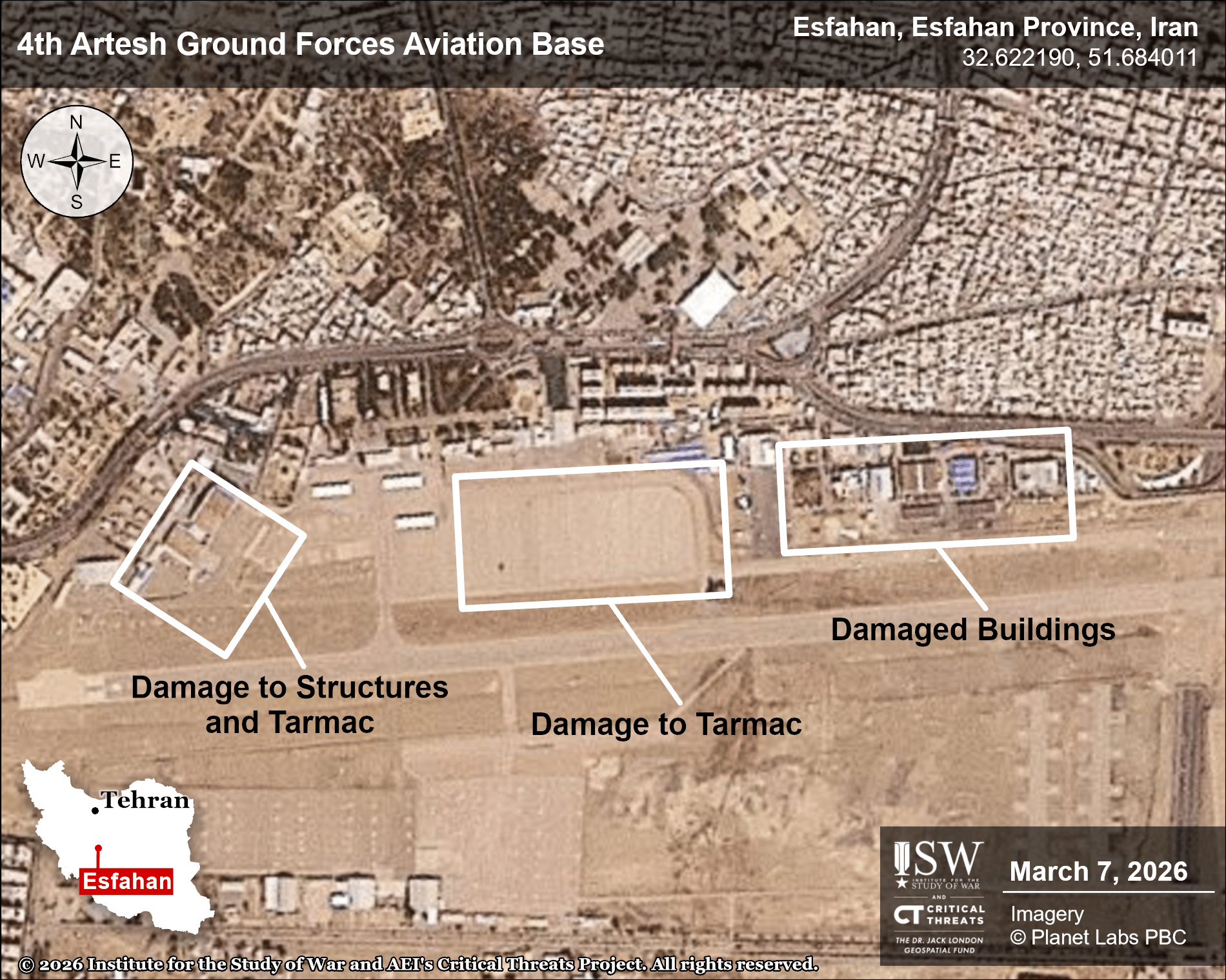 Satellite imagery reveals extensive damage to Esfahan missile bases and aviation facilities following coalition strikes (Planet Labs / ISW analysis).