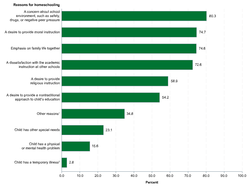 The reasons are no mystery. According to the U.S. Department of Education’s 2023 National Household Education Surveys (the most recent detailed national data), parents of homeschooled children cited the following as “important” factors (they could pick more than one):